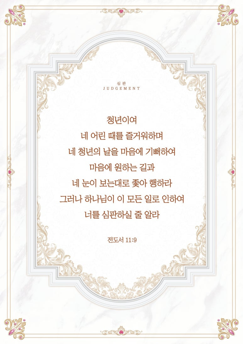 청년이여 네 어린 때를 즐거워하며 네 청년의 날을 마음에 기뻐하여 마음에 원하는 길과 네 눈이 보는대로 좇아 행하라 그러나 하나님이 이 모든 일로 인하여 너를 심판하실 줄 알라