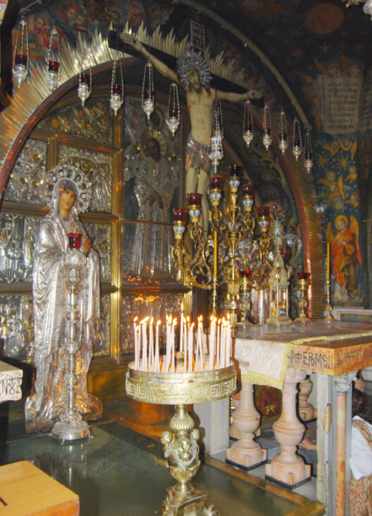 제단 위 사진에서 보이시는 바와 같이 뒤편에는 예수님께서 십자가에 달리신 모습을 표현하였고, 제단 옆으로는 예수님께서 운명하실 때 갈라졌다는 바위가 있습니다.